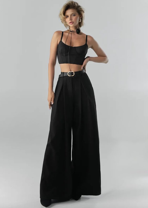 - Вечерние образы. Атласные или плиссированные брюки + топ с драпировкой или корсет, акцентные серьги, обувь на каблуке — в этом случае важно подчеркнуть линию талии и соблюсти пропорции.