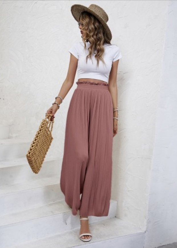 - Мягкие оттенки желтого — цвет сливочного масла или персиковые оттенки хорошо работают в струящихся и шелковых брюках, создавая «светящийся» эффект.