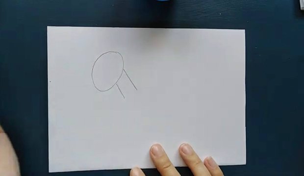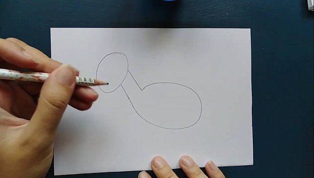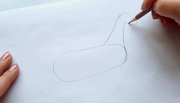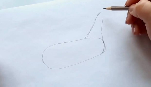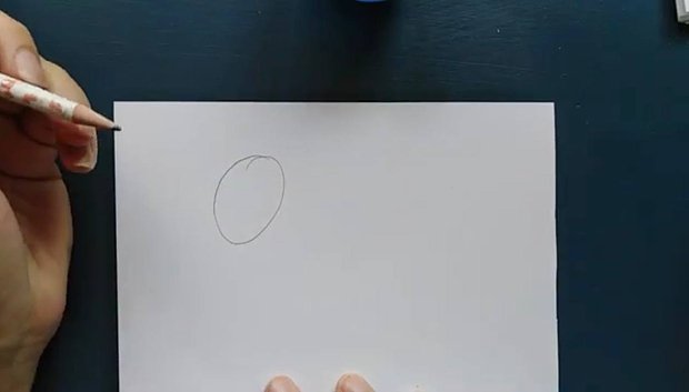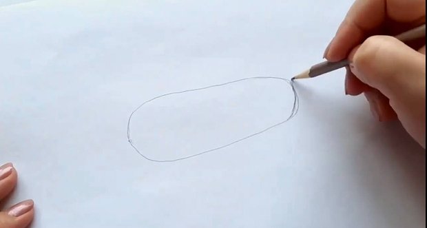 - начните с рисунка карандашом. В центре листа изобразите горизонтальный овал, чуть сужающийся к правому краю;