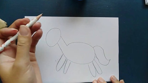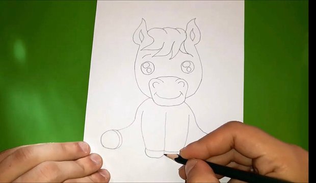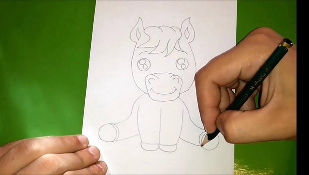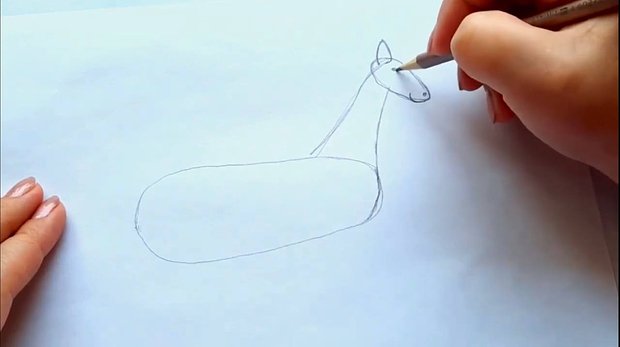 - на краю шеи нарисуйте продолговатый овал (гораздо меньше туловища размером). Нижний край овала тоже должен быть слегка заужен, это морда лошади;