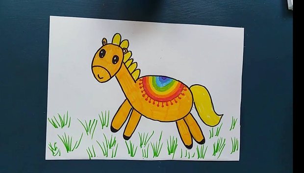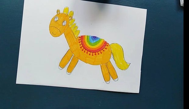 - осталось раскрасить лошадку: туловище может быть желтым, коричневым, черным и вообще любого цвета. Накидку можно сделать радужную, а копыта, гриву и морду — одного цвета;