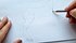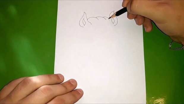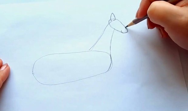 - проведите по линии вниз от обоих ушей. Линии должными были не прямыми, а закругленными — это контур морды. Не соединяйте эти линии;
