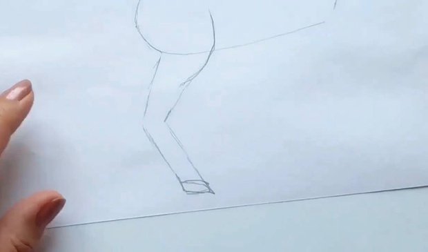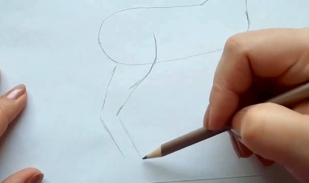 - приступайте к рисованию ног, начните с задних. Полукругом обозначьте бедра, от них ведите угол влево, а из него прямые линии вниз;