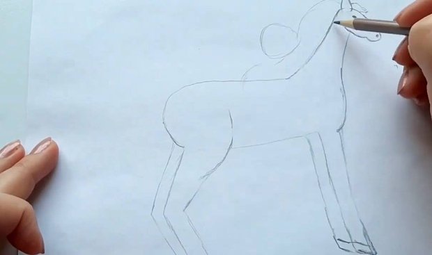 - сверху на морде нарисуйте уши, а от середины головы и до места соединения шеи и туловища — гриву. Ее можно изобразить полукругами;