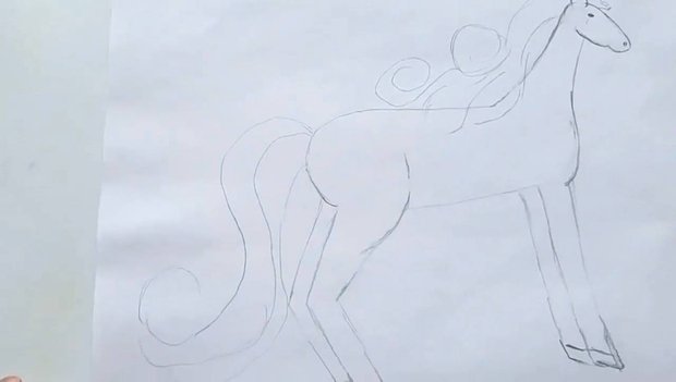 - из морды лошади проведите линию вниз, которая делает небольшой полукруг влево;
