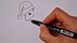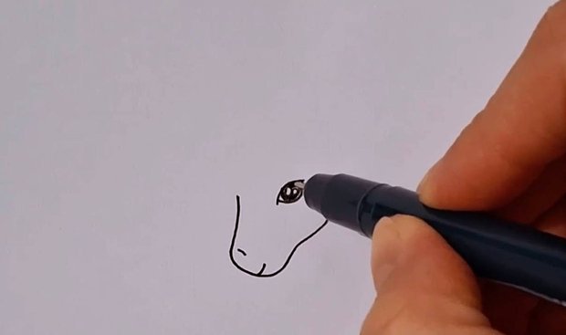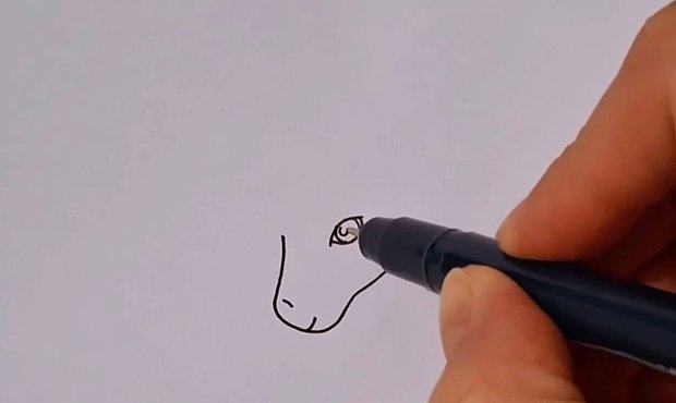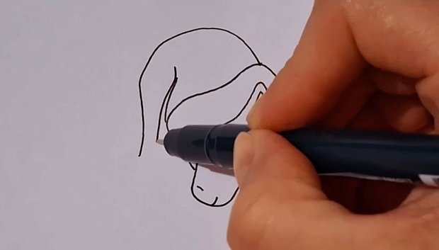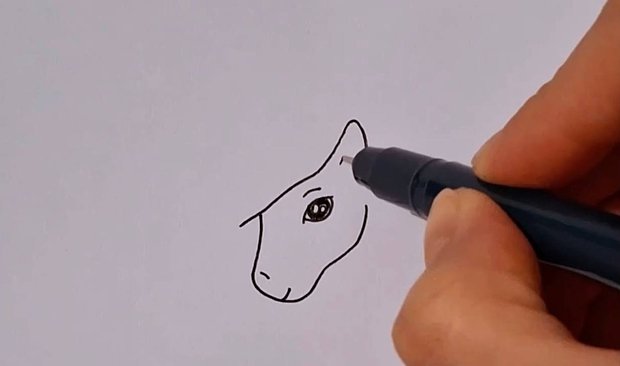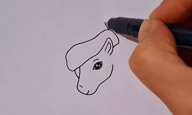 - черной ручкой или маркером нарисуйте морду лошади, которая смотрите влево. Получится неровный овал, чуть сужающийся к концу. Сразу добавьте линиями рот, нос и глаз;
