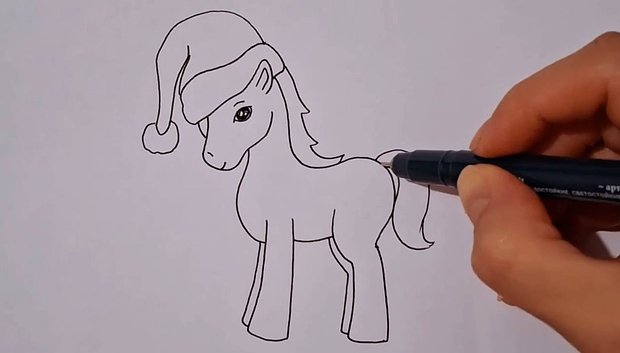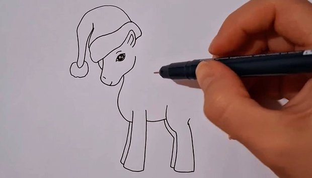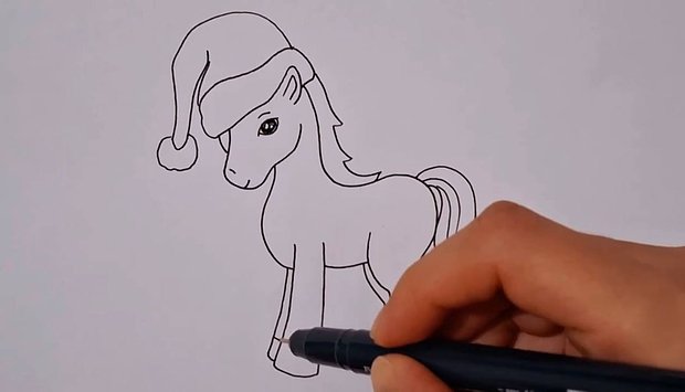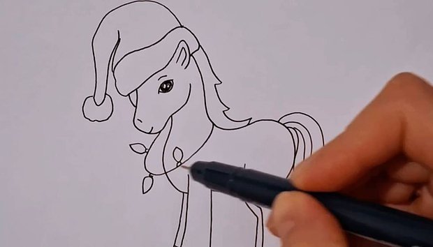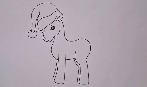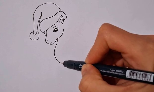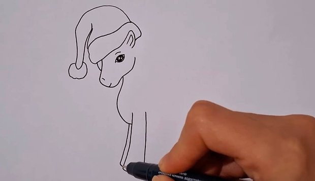 - дорисуйте колпак — проведите от пушистой части шапки линию влево и вниз за край морды лошади, внутри нарисуйте сгиб колпака;