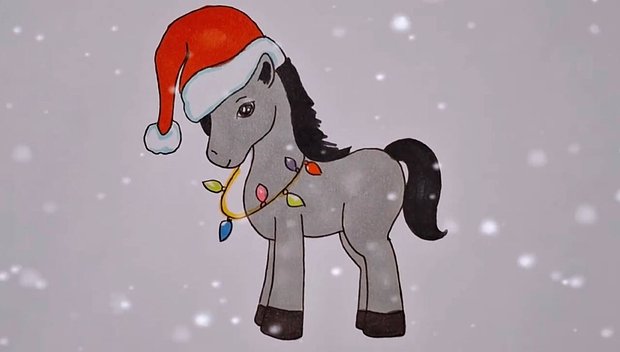 - раскрасьте лошадь. Колпак сделайте красным,а огоньки на гирлянде — цветными.