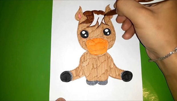 - осталось раскрасить лошадку. Начните с туловища, потом добавьте цвет хвосту и гриве. Они должны быть одного цвета — так получится красивее. А глаза, нос и копыта обозначьте черным фломастером, чтобы они не слились с красками.