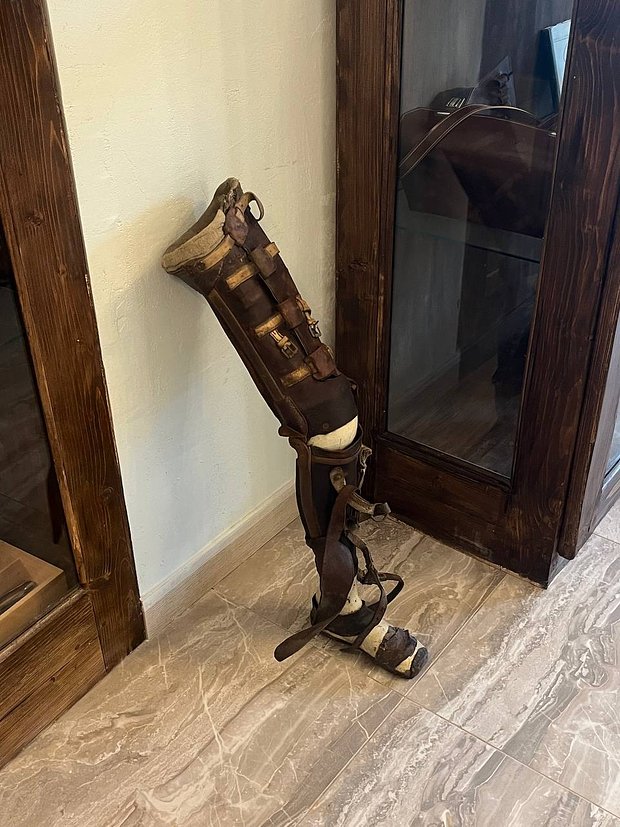 «Это одна из первых бормашин — такие выпускали в начале XX века. Она с ножным приводом. Доктор качал педаль, крутилось колесо, как на швейной машинке, вращался бор — и врач сверлил зуб. А это педаль от насоса для бормашины — с ее помощью ассистент подавал воздух, которым полость зуба охлаждалась и очищалась», — рассказывает об одном из самых необычных экспонатов коллекции предприниматель Валерий Фетискин, основатель музея «Старицкая вольная аптека провизора Ивана Щукина».