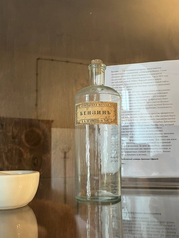 Впрочем, до революции аптеки торговали не только лекарствами, но и множеством других товаров. К примеру, косметикой и парфюмерией — в музее выставлено мыло, духи, «Тройной одеколон» для мужчин. Можно было купить и бритвенные принадлежности, и средства для борьбы с клопами и тараканами, и даже бензин. Примечательно, что бензин продавали в изящных граненых флаконах объемом 300-500 миллилитров — хозяйки использовали его для чистки платьев, перчаток и шляп, так как он отлично выводит пятна от жира.