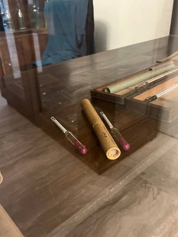 «Мне кажется, самыми ходовыми лекарствами в то время были мази, — замечает Валерий. — По крайней мере баночки от них встречаются в большом количестве». Кроме флаконов от препаратов, есть в «Старицкой вольной аптеке» и старинные медицинские принадлежности: стеклянные шприцы для инъекций, ртутные термометры, банки (выдувавшиеся вручную, они были крупнее и не такие гладкие, как советские), стетоскопы, очень точные весы для взвешивания порошков и таблеток и даже красивая грелка.