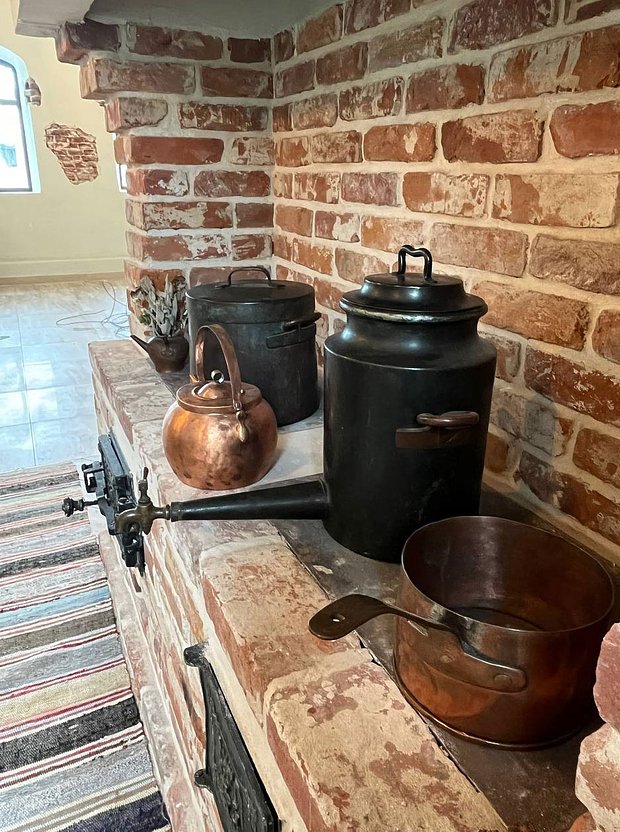 Второй и третий залы музея пока еще в работе. В лаборатории будет воссоздано помещение, в котором провизоры готовили лекарственные препараты. Здесь уже сложена печь, которая, по словам Валерия, в точности повторяет печи химических лабораторий — с несколькими топками и большими плитами. На плите, помимо медных тазов и кастрюль, стоит термос с длинным носом — его постоянно держали на углях, чтобы вода в нем оставалась горячей. Чуть позже в этом зале появится длинный стол, на котором сотрудники музея хотят собрать химические приборы — для этого уже припасены колбы, реторты и лабораторный штатив.