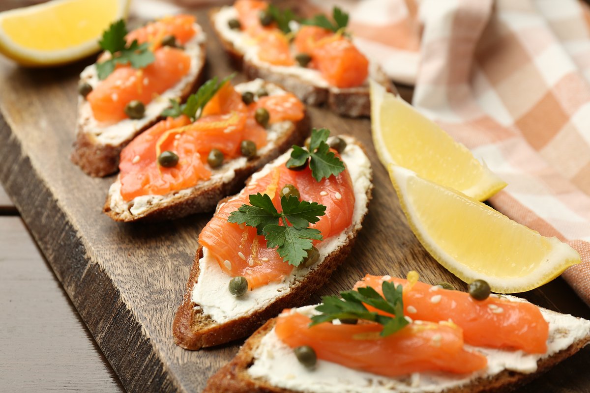 Брускетты с рыбой традиционно ассоциируются с праздничной кухней. Для этого блюда понадобится слабосоленая семга и сливочный сыр.