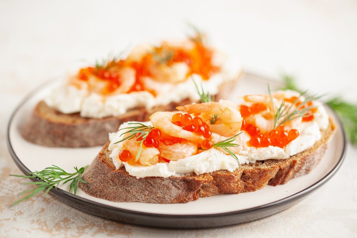 Такие брускетты часто подают в варианте с красной икрой, заменяя рыбу или в дополнение к ней. Популярна в таком виде и брускетта с сельдью и бородинским хлебом. К ней отлично подойдет красный лук.