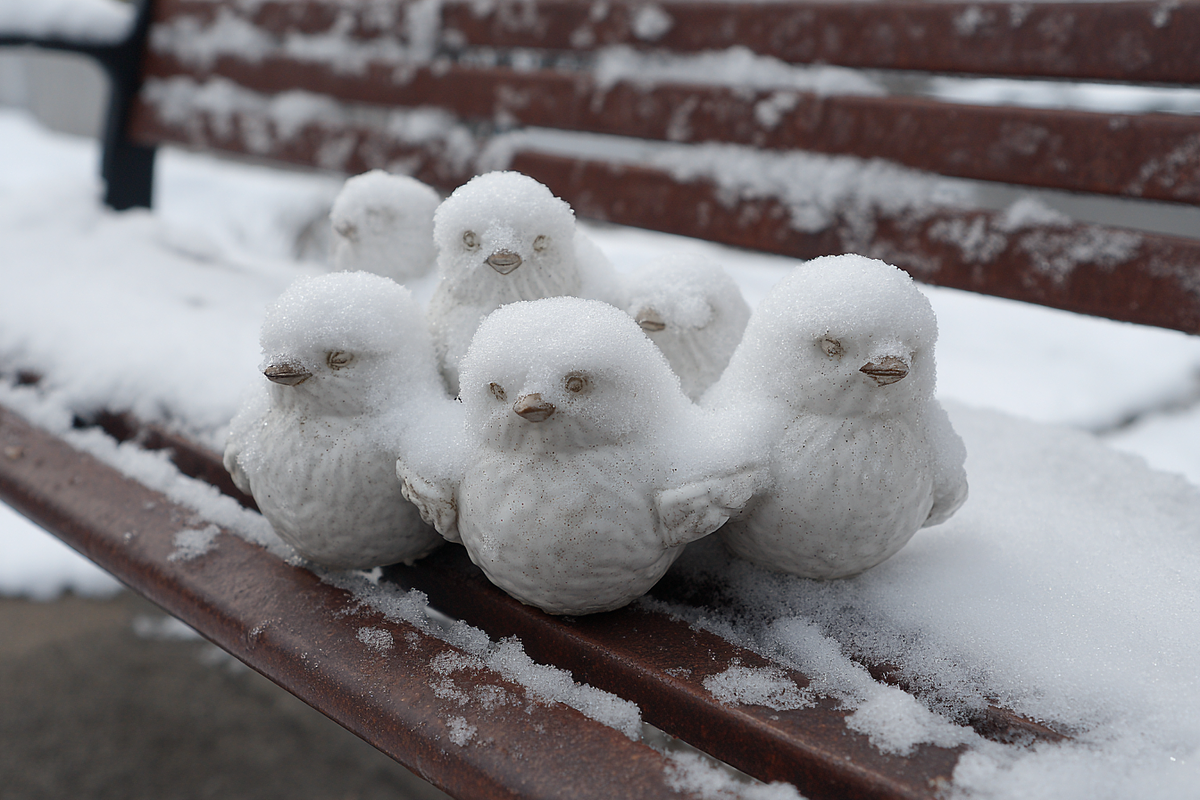 - сделайте несколько снежков примерно одинакового размера, положите их рядом друг с другом — пусть они соприкасаются, как будто птицы замерзли и жмутся друг к другу;