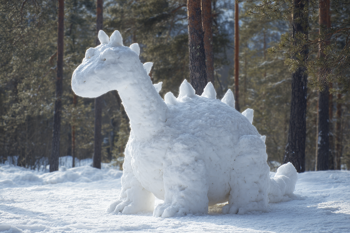 Самый простой вариант — слепить динозавра с длинной шеей, сидящего на земле. Если хотите большого и стоячего, то придется делать каркас из веток или льда.