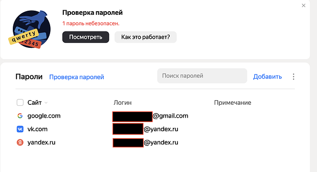 - В появившимся окне кликните на «Пароли и данные», а затем на «Пароли». В зависимости от браузера, последовательность действий и названия могут незначительно отличаться. Например, в Google сначала нужно нажать на «Пароли и автозаполнение», а затем — на «Менеджер паролей».