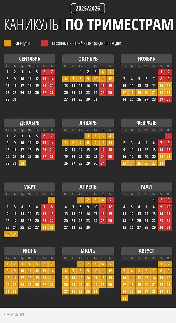 В документе также уточняется, что в этом учебном году школьникам предстоит учиться с 1 сентября 2025 года по 26 мая 2026-го. Сроки окончания учебы для девяти- и одиннадцатиклассников, как и даты проведения последних звонков, зависят от дней ОГЭ и ЕГЭ.