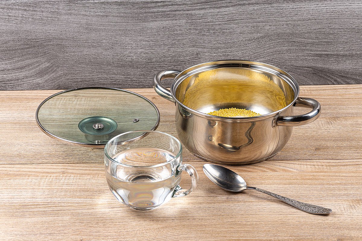 - Пшено промойте горячей водой несколько раз, залейте кипятком на пять минут.
