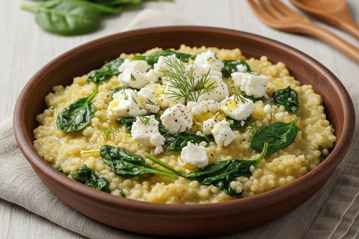 - В еще горячую готовую кашу добавьте шпинат и укроп. Накройте крышкой на две-три минуты.