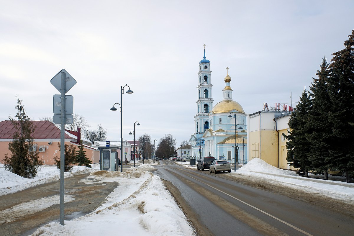 Эта небольшая площадь — одно из самых уютных мест старой Каширы. Попасть к ней просто — надо ориентироваться на шестиярусную голубую колокольню церкви Введения во храм Пресвятой Богородицы, это доминанта всего города.