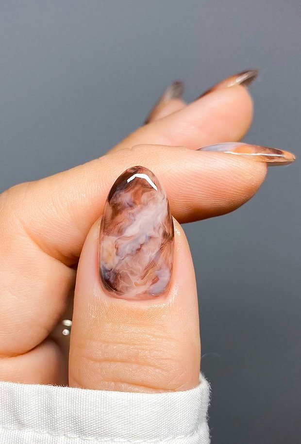 Популярным остается и мраморный маникюр в кофейной палитре. Узор создается путем смешения прозрачных бежевых и коричневых лаков, за счет чего на каждом ногте получается уникальный размытый рисунок.