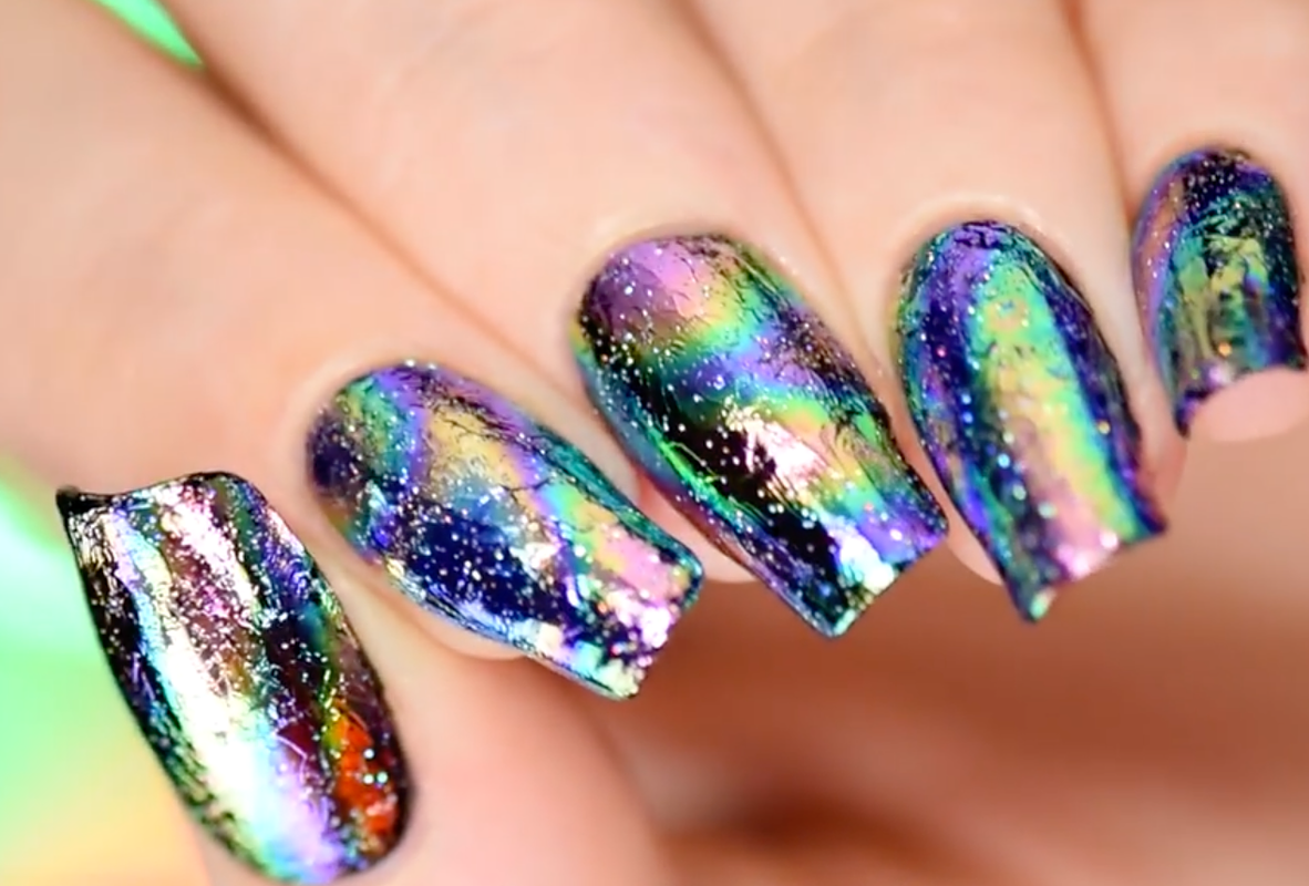 Для создания этого дизайна потребуется полупрозрачный лак насыщенного цвета. Особенность маникюра в том, что на темном покрытии с металлическим блеском видны радужные переливы, как на разлитом бензине.