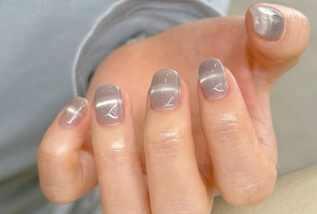 Этот тренд, пришедший из Южной Кореи, — одна из интерпретаций «кошачьего глаза». Его отличительная черта — горизонтальная геометрическая линия поверх переливающегося градиентного покрытия.