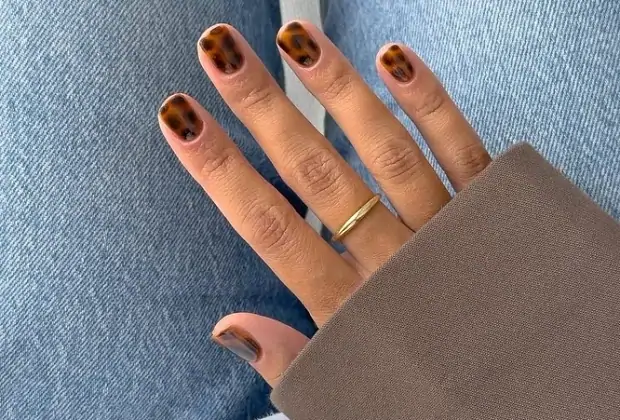 Имитирующий расцветку панциря черепахи принт можно назвать альтернативой шоколадным и кофейным оттенкам. Главное в таком маникюре — многослойность: сначала на ногти наносится полупрозрачная база теплых оранжевых и медовых тонов, сверху — коричневые или черные пятна. Причем чем более хаотично они будут распределены, тем «живее» будет выглядеть рисунок.