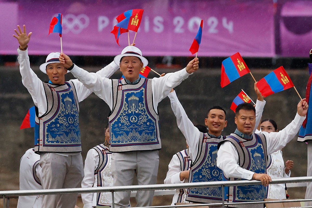Монголы вышли в образах, навеянных национальным костюмом дээл: мужчины и женщины были одеты в длинные белые сюртуки-платья с жилетами, а пояса последних дополняли крошечные кошельки-мешочки. Каждый наряд украшала тончайшая золотая вышивка в виде символов монгольского герба соембо, а также олимпийского огня и колец.
