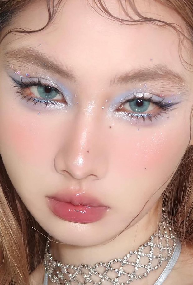 «Под влиянием азиатской моды стало модно выделять уголок глаза и область под бровью голубыми тенями. Их используют вместо хайлайтера, которым раньше было принято высветлять эти зоны. А само веко, как правило, затемняют коричневым оттенком», — поделилась автор канала «Блестючка».