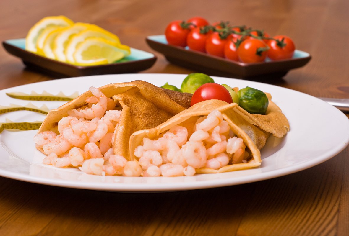 - Немного остудите креветки, сбрызните их лимонным соком и добавляйте в блинчики.