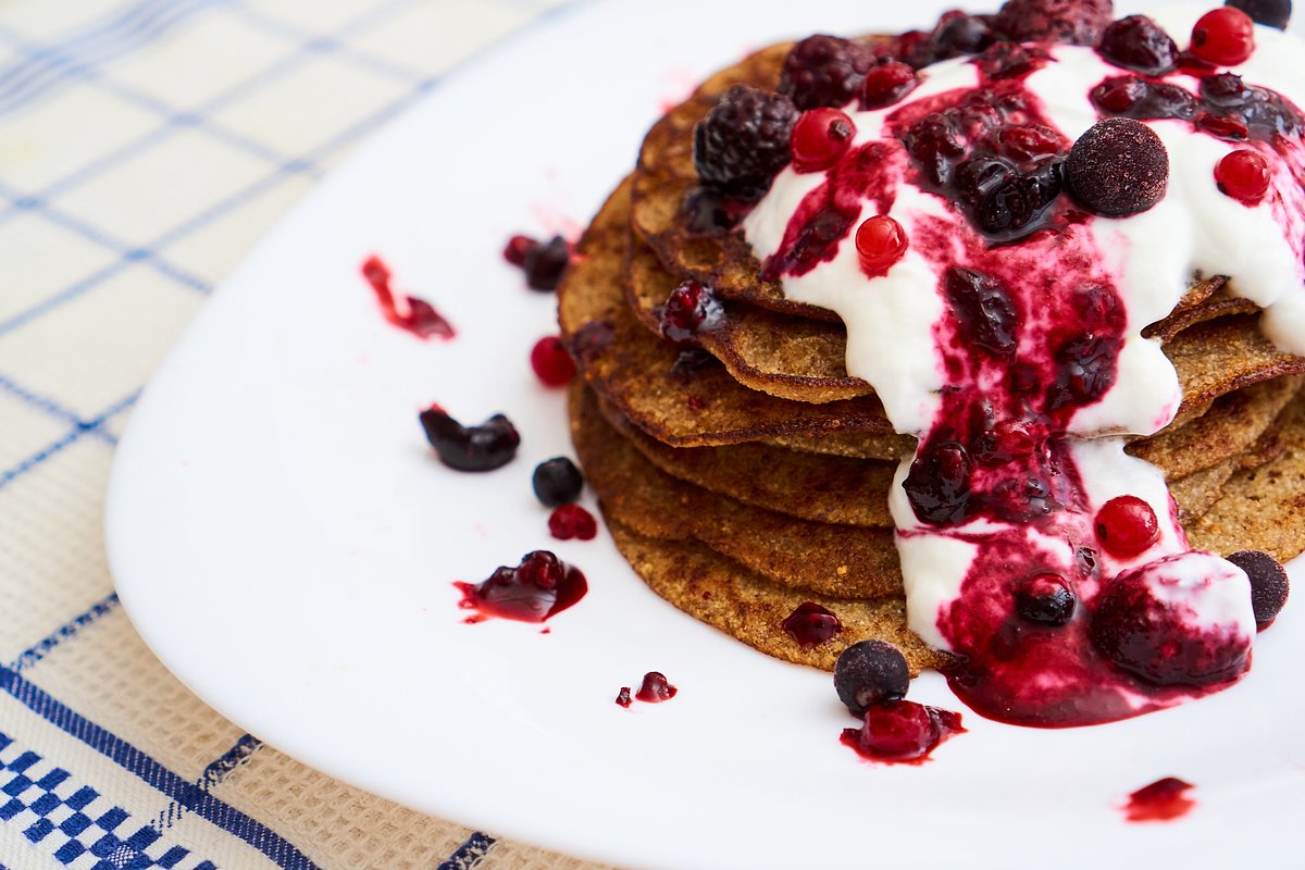 - Выложите в готовые блины по ложке сметаны, а сверху — ягоды с сахарным сиропом.