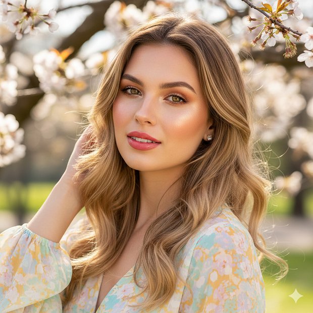 Цветотипу «Весна» идеально подходят натуральные оттенки волос. Но если хочется экспериментов, выбирайте окрашивание в теплой золотистой гамме — от светлого пшеничного блонда до теплого каштана. Если есть желание добавить блики, стоит обратить внимание на легкое мелирование или шатуш.