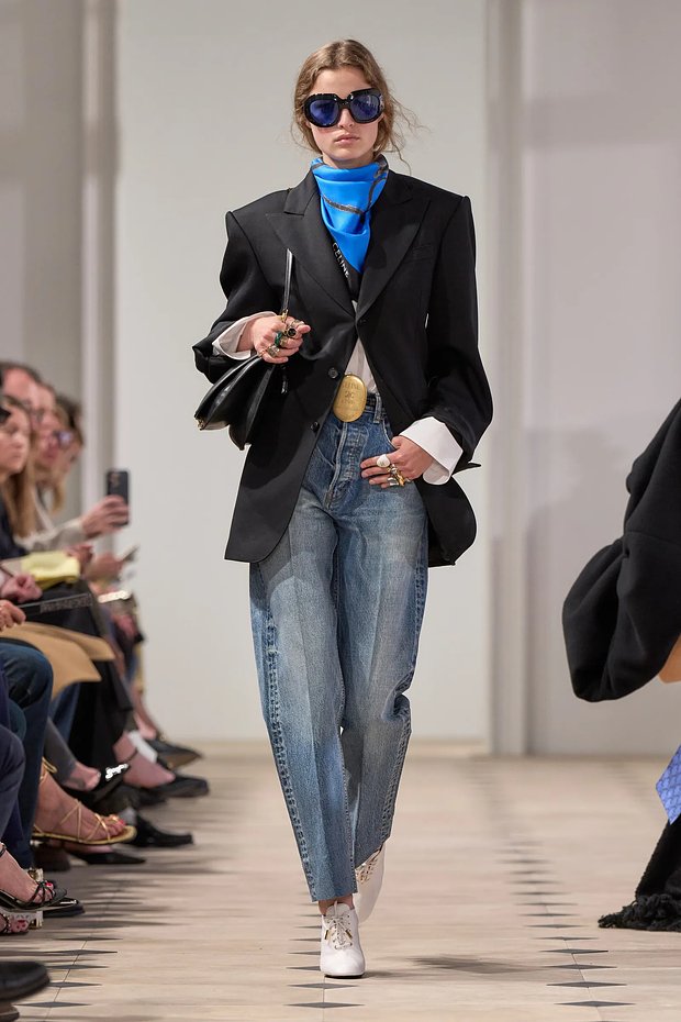 Saint Laurent в новой коллекции делает акцент на объемы: кожанка оверсайз с подплечниками, акцентные детали на блузе и крупные золотые украшения.
