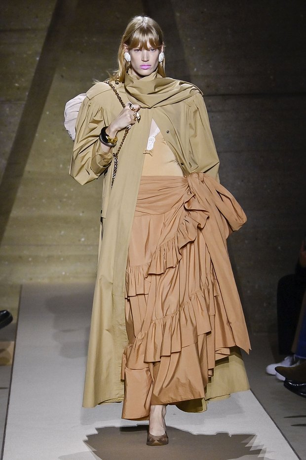 Помимо классических вариантов в бежевых тонах, в моде тренчи в оттенке хаки, черном или сером. Обращайте внимание и на крой плаща. Особенно актуально сейчас выглядят увеличенные плечи в стиле 1980-х, воротник-стойка, укороченный вариант с заниженной линией талии или асимметричным пошивом как у бренда Carven.