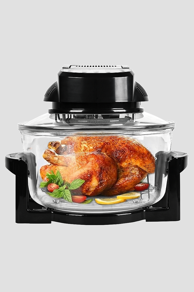 Корпус таких аэрогрилей сделан из жаропрочного стекла. Сверху на нем закрепляется крышка с панелью управления, в нее же встроены нагревательный элемент и вентилятор.