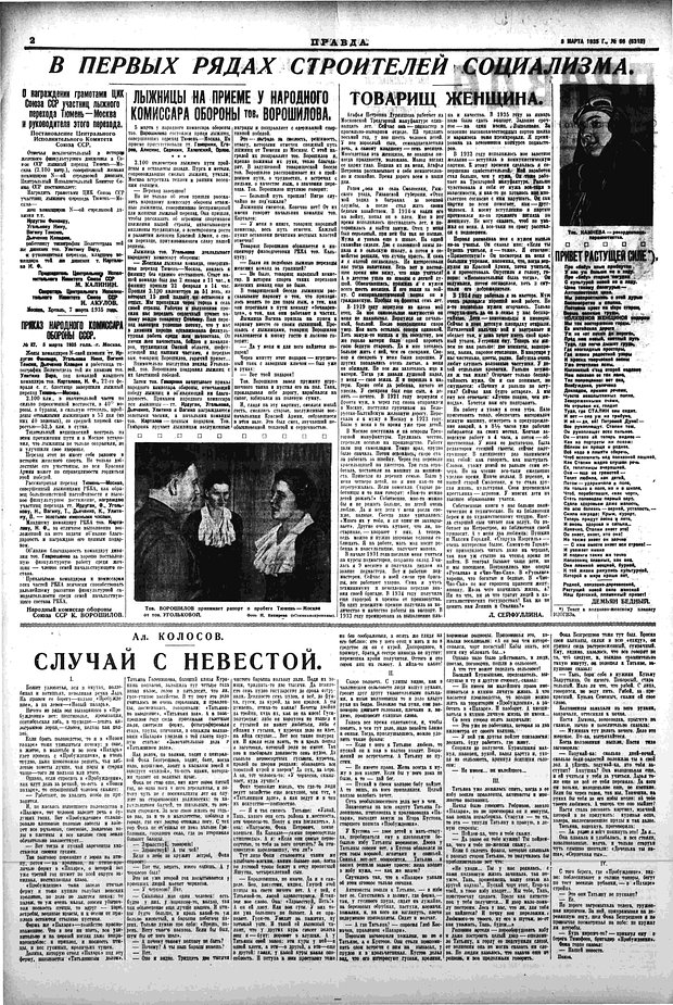 В этой программной поэме Бедный манифестирует конец патриархального рабства («от печки до порога»), заменяя его героическим мифом о колхознице. Через каторжный труд («поработавши, как черт») она пробивается на кремлевскую трибуну, чтобы увидеть Сталина.