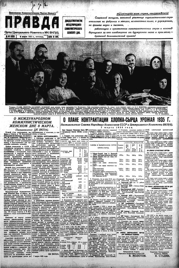 Идеологически ей выделили не только место (у станка и колыбели), но и время. 8 Марта стало днем получения ценных указаний. Праздник, который все еще был рабочим днем, превратился в ежегодный отчет: как женщина помогает стране готовиться к неизбежной войне.