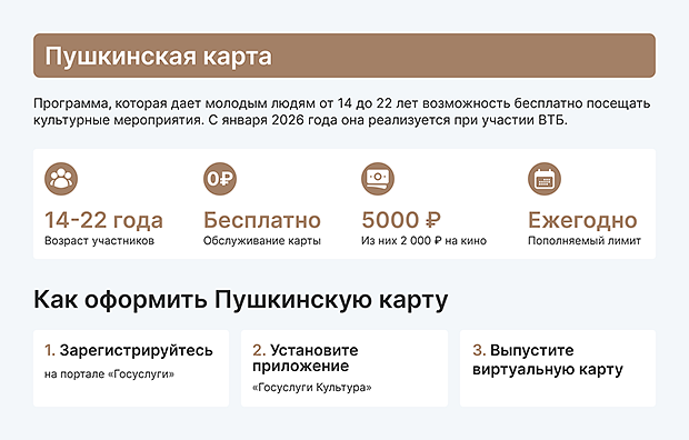 В 2026 году банком-оператором «Пушкинской карты» стал ВТБ и уже выпустил более 6 миллионов карт