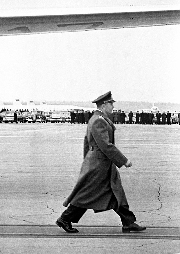Затем они сели в семиместный ЗИЛ‑111B-кабриолет — то есть сели Хрущев и Валентина, а Гагарин, “в традициях американских конфетти-парадов”, поехал стоя, на манер принимающего парад генерала. “Если сейчас вы посмотрите кадры, то Хрущев там еле угадывается на заднем сиденье” — но “явно наслаждался триумфом и воспринимал первый полет в космос как свой политический успех, но при этом уже не возвышался над «героем дня»”.
