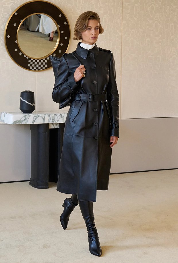 Такой тренч в ретро-стиле будет смотреться актуально даже с простыми базовыми вещами. В этой же коллекции бренд представил другую «чистую» модель плаща без лишних деталей, но в кожаном варианте.
