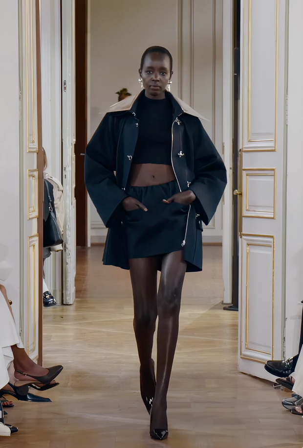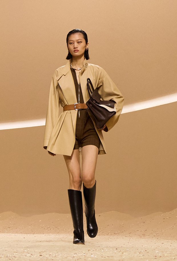 Hermès показали укороченный тренч с коротким комбинезоном и длинными сапогами