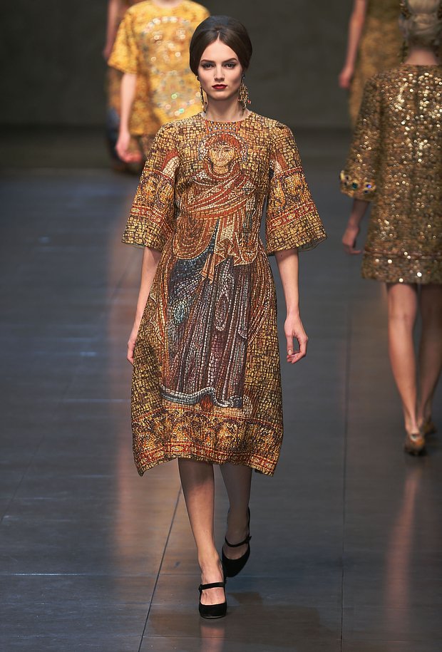 Порой религиозная эстетика в моде оказывается не просто источником вдохновения, а продолжением личной биографии дизайнера — об этом как раз и говорил Болтон. Коллекция 2013/14 итальянского модного дома Dolce&Gabbana была вдохновлена мозаиками сицилийского Собора Монреале, чья история перекликается с судьбой Доменико Дольче, выросшего на Сицилии.