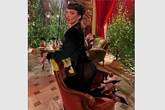 Также экс-участница реалити-шоу «Дом-2» надела мюли на каблуках, уложила волосы в пучок в стиле ретро и нанесла макияж с черными стрелками на веках и коричневой помадой на губах.