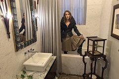 Помещение оформлено в бело-серых тонах с акцентами из черного дерева. Сама ванна выполнена из камня. Особое внимание привлекают светильники в виде рогоза с двух сторон от зеркала и уникальные китайские плакаты.