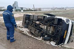 «В момент ДТП в автобусе, кроме водителя, находились 7 человек, при опрокидывании два пассажира получили телесные повреждения», — сказано в публикации.