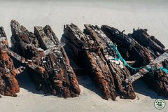 Остов судна, перевозившего партию апельсинов из Пуэрто-Рико в Нью-Йорк, показался из песка благодаря зимним штормам и мощным волнам, обнажившим его массивные деревянные шпангоуты.
