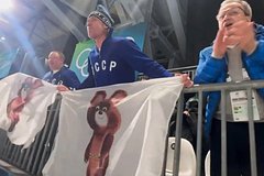 Двое фанатов в свитерах с надписью СССР размахивали флагами с олимпийским мишкой из Игр-1980 в Москве. Они выступили с перфомансом в Милане на стадионе «Спид Скейтинг».